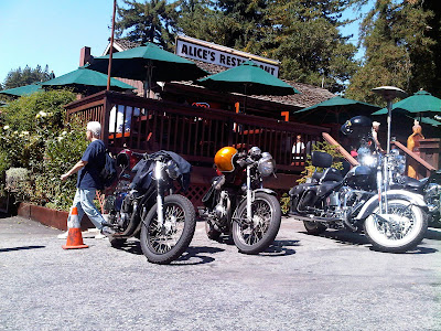 almost 2 years after dumping my Triumph, I made a 2 person seat so Karen could go on rides again. Alices Restaurant ride to Pescadero back to La Honda, Apple Jacks Pub